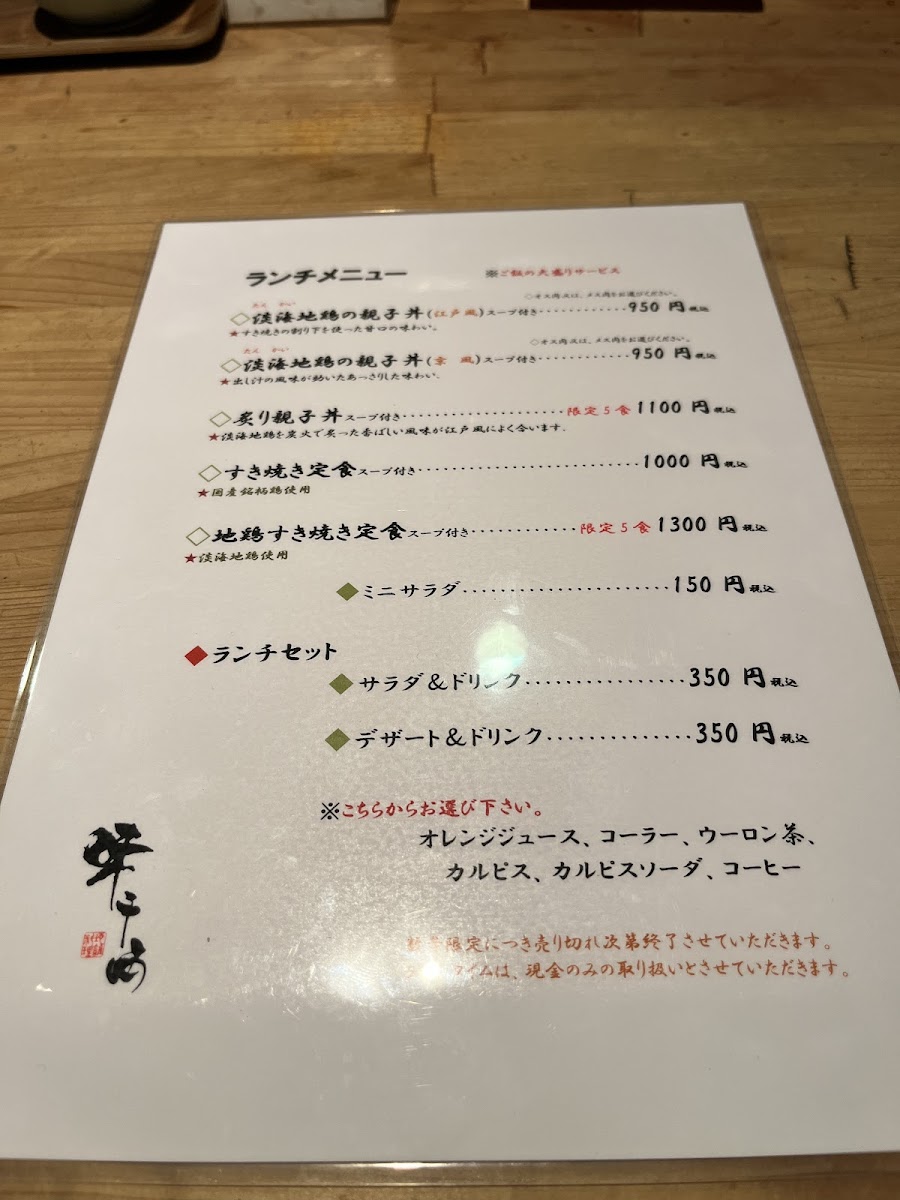 The menu at Ajisenryo Ritto offers a delightful array of traditional Japanese dishes, with a special emphasis on chicken preparations that are both authentic and expertly crafted. For those seeking a truly unique experience, the ランチ 限定 炙り 親子 丼 stands out as a must-try, featuring tender grilled chicken and a perfectly balanced combination of rice and eggs. The キモ is another dish that highlights the richness of the flavors, with grilled chicken liver offering a deep, savory taste that pairs wonderfully with the other menu items. For a hearty, comforting meal, the すき焼き定食 ※国産銘柄鶏使用 delivers a premium sukiyaki experience using high-quality domestic chicken, creating a rich, flavorful broth that complements the tender meat. If you're a fan of hot pot dishes, the 鶏のすき焼き brings a satisfying, well-seasoned chicken-based version that warms the soul. Those with a penchant for raw dishes will appreciate the 鶏の刺身, offering fresh, delicate cuts of chicken sashimi that highlight the freshness of the ingredients. For a flavorful appetizer, the つくね (chicken meatballs) are an excellent choice, juicy and seasoned to perfection. The 焼き鳥重 is another standout, providing skewered chicken served over rice, delivering a comforting and fulfilling meal. Finally, the 前菜です offers a variety of smaller dishes, perfect for starting the meal or sharing with others. Ajisenryo Ritto’s menu showcases a harmonious blend of traditional flavors and expert preparation, making it an ideal destination for lovers of authentic Japanese cuisine.